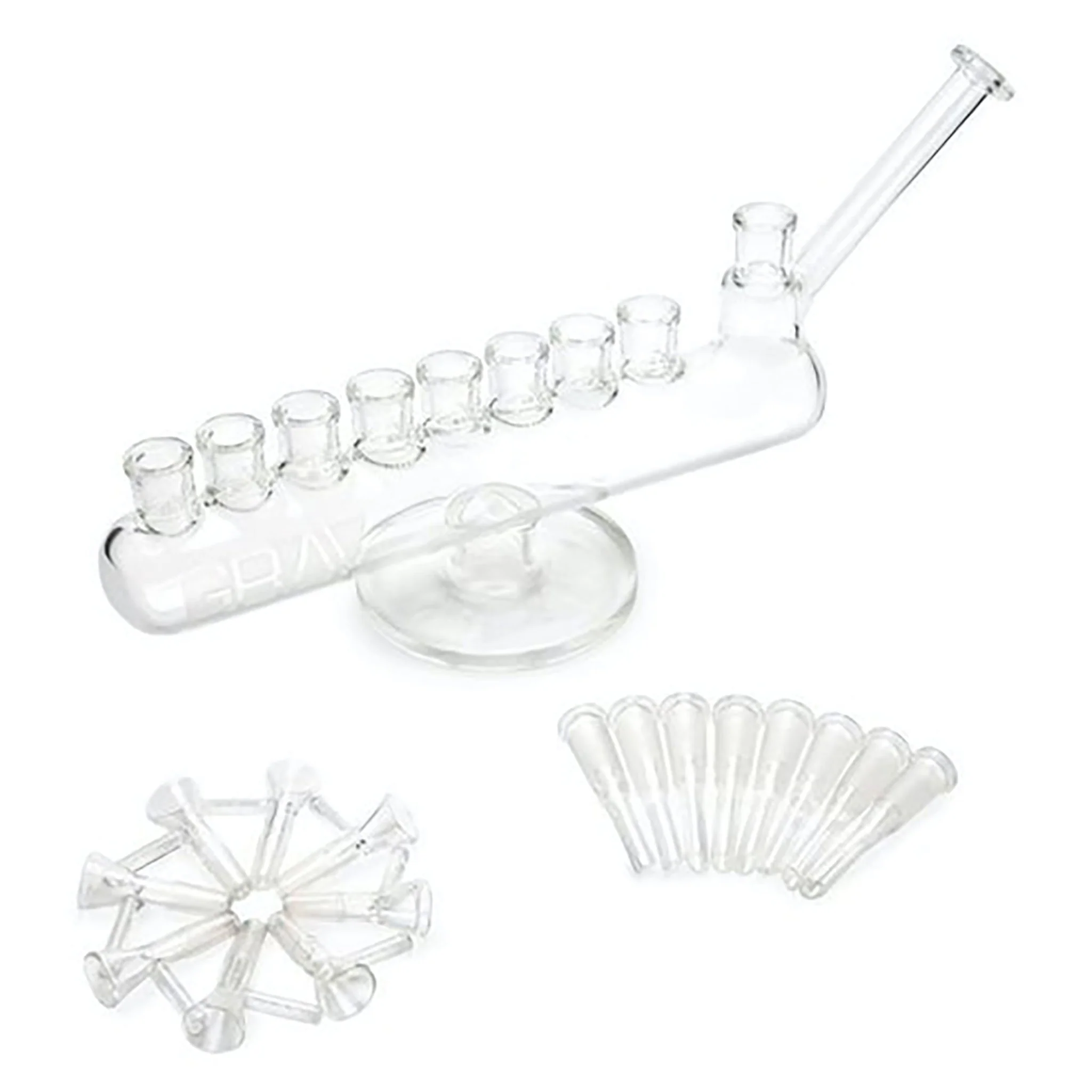 Push your limits, but don't be afraid to tap out since this unique bong produces insane rips that's equivalent to eight hits in one! Place the downstems and pack all eight of the included funnel-shaped bowls for an unforgettable smoking sesh with your friends. Everyone will want to test the power of the GRAV Menorah Bong for themselves and compete for the biggest rip of the night. This 14-inch long water bong is blown from high-quality transparent glass so you can watch all the smoke accumulate and bubbles form. To be extra sure that your giant bong rips don't pull up any dirty water, the mouthpiece is offset and angled away from the water chamber. Get ready for a hit you'll remember forever!