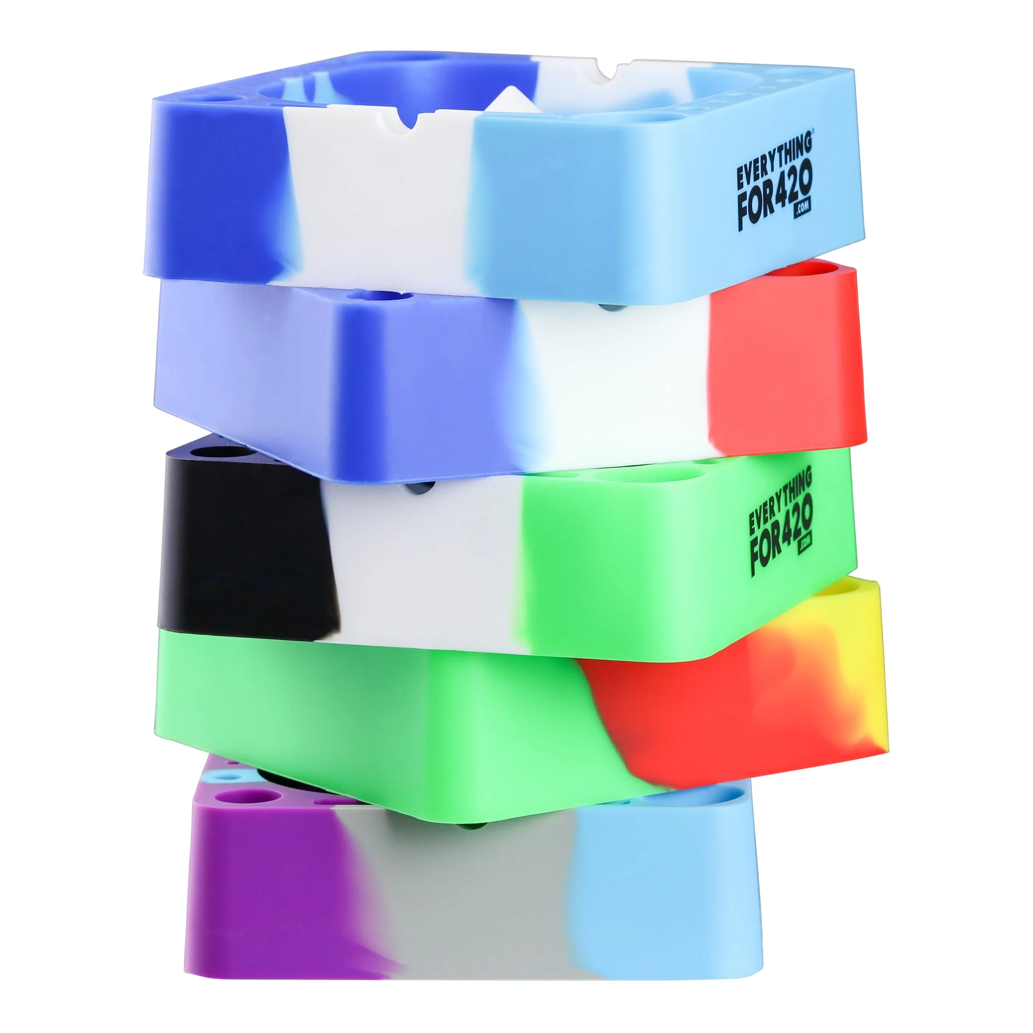 This dab ashtray is one of those things you never knew you needed. The colorful heat-safe silicone makes this ashtray perfect for those who dab, but don't be fooled, it's a great ashtray for flower lovers too! Get organized using the various storage slots that are designed for holding hot dab tools, bangers, bong bowls, lighters, packs of rolling papers, vape batteries, and more! Most importantly, the central pyramid helps you easily clear out ash and gunk for a better burn. No need to get your fingers sticky! Available in a variety of vibrant colors, these silicone ashtrays will be chosen at random by one of our warehouse pickers, so you'll be in for a surprise.