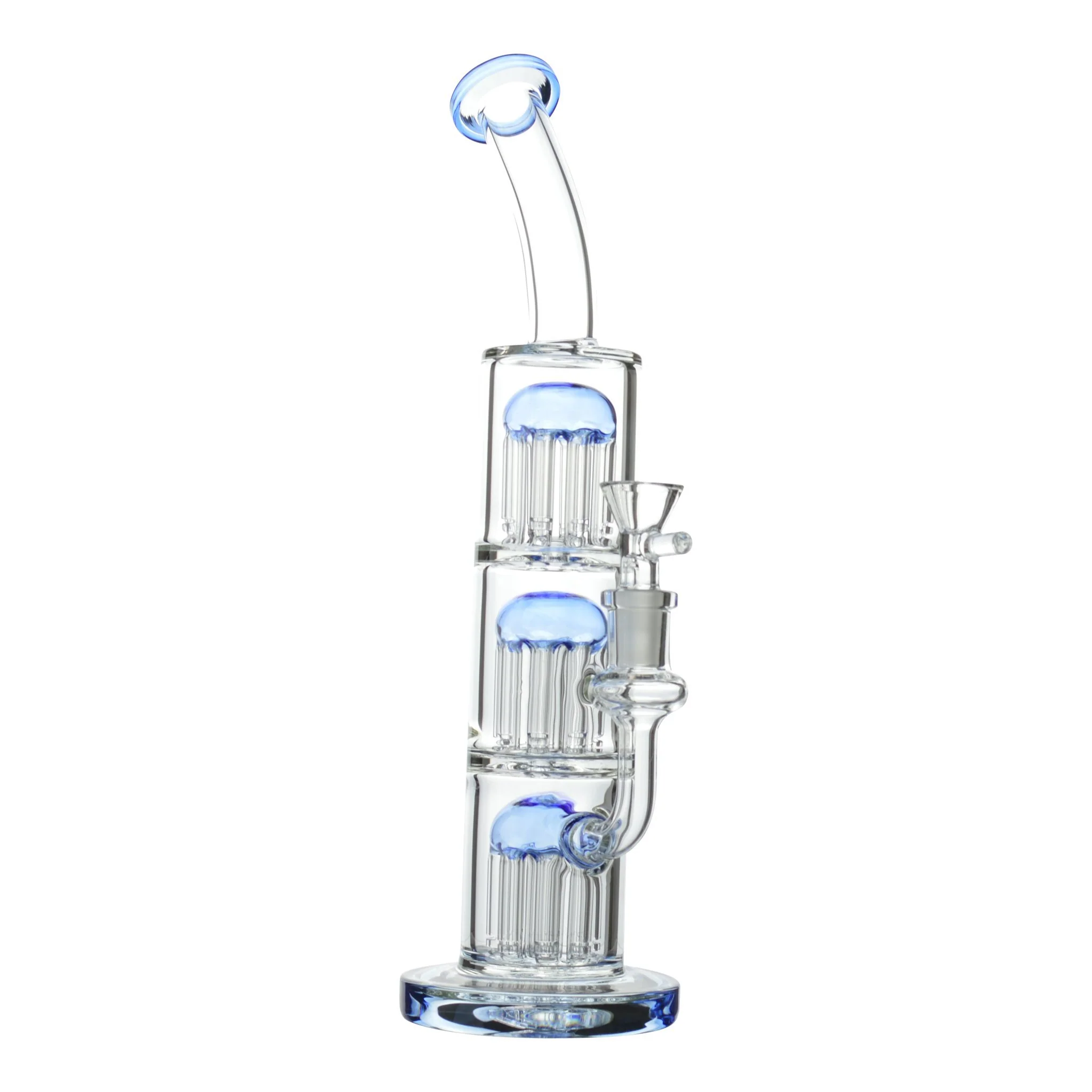 The Triple Barrel Bong's sleek and stylish appearance makes it a great statement piece that can fit right in with your home decor, but is also small enough to store easily if you don't want to advertise your smoking lifestyle. Available in transparent blue, shiny jade, or decadent green, this 14-inch water pipe creates lots of bubbles that are fun to watch. The percolator bong produces smooth, comfortable hits thanks to the filtration power of three stacked jellyfish percs that get the job done quick. Dirty bong water doesn't travel too high because of the angled neck and tapered chambers.