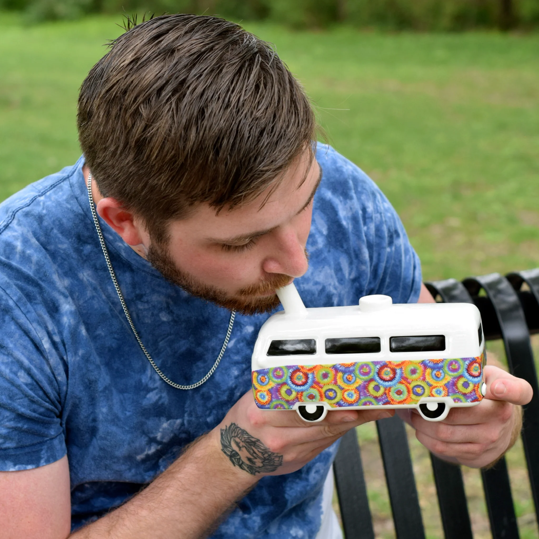 All aboard the vintage hippie bus! It's time to take a ride to stoner town. Complete your boho look with a functional accessory, a novelty pipe that looks like a vintage VW bus. Available in tye dye or flower power designs, this smoking pipe is ready to take you on the ride of your life and will be the center of attention at any smoke sesh. This cool pipe is made with thick ceramic walls, a low profile, and a stable base that keeps it upright at all times. Comfortable to hit, the bowl is directly in front of the angled mouthpiece for easy access. Keep the party going and complete your set with the matching Vintage Bus Stash Jar.